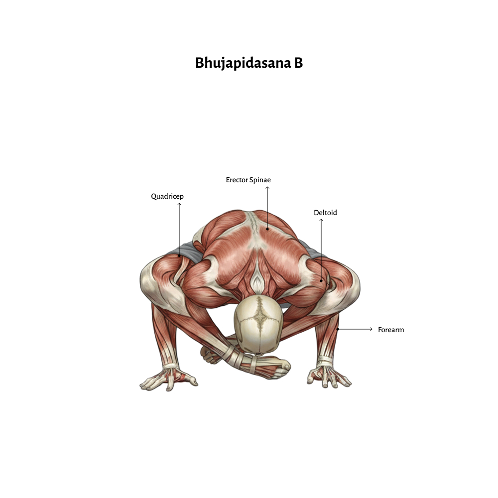 Bhujapidasana (भुजपीडासन), or Shoulder-Pressing Pose, is an advanced arm-balancing yoga posture. The name comes from the Sanskrit words “bhuja” (arm or shoulder), “pida” (pressure), and “asana” (posture). The pose gets its name from the pressure of the inner thighs on the upper arms and shoulders.