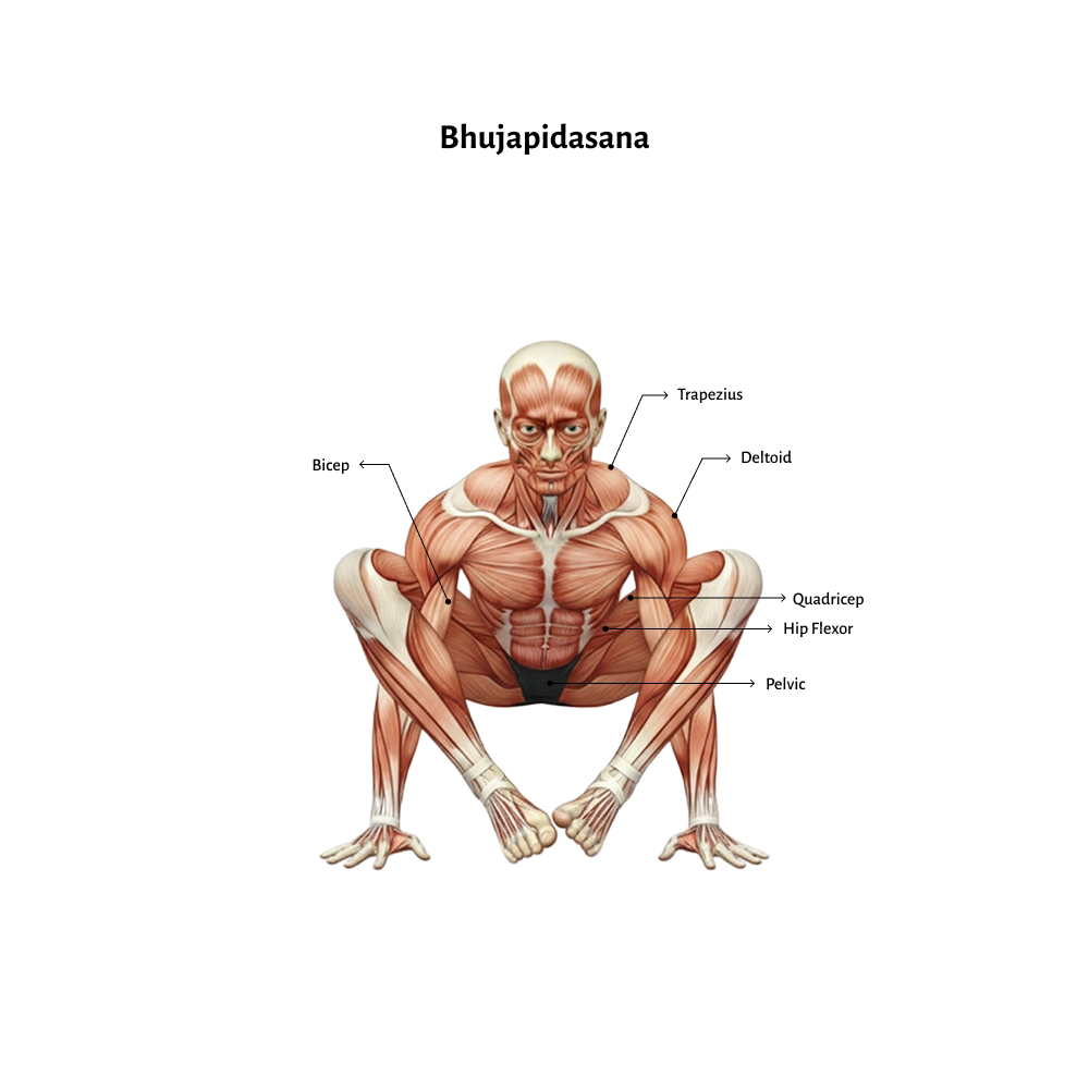 Bhujapidasana helps to stretch and open the hips and groins, increasing flexibility.