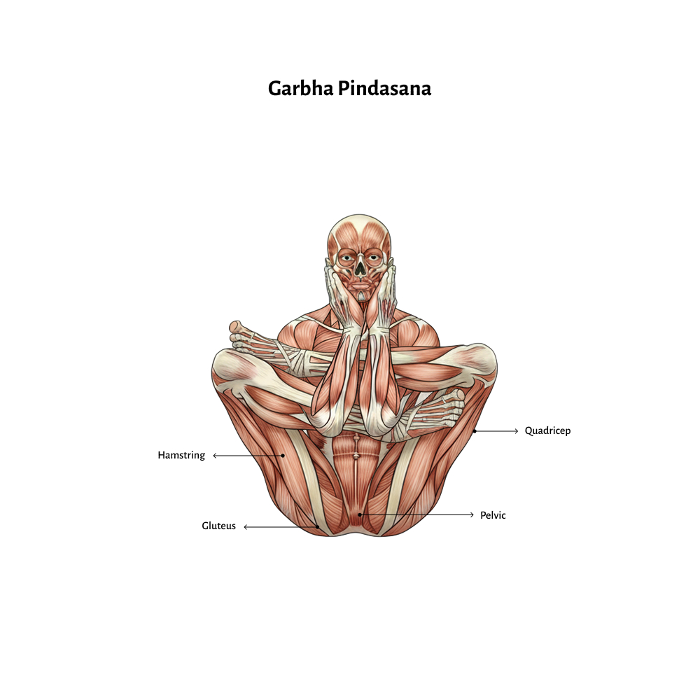 Garbha Pindasana (गर्भ पिंडासन), or Embryo Pose, is a seated yoga posture that involves a half-lotus position and a core-strengthening bind. The name comes from the Sanskrit words “garbha” (embryo or fetus), “pinda” (body), and “asana”