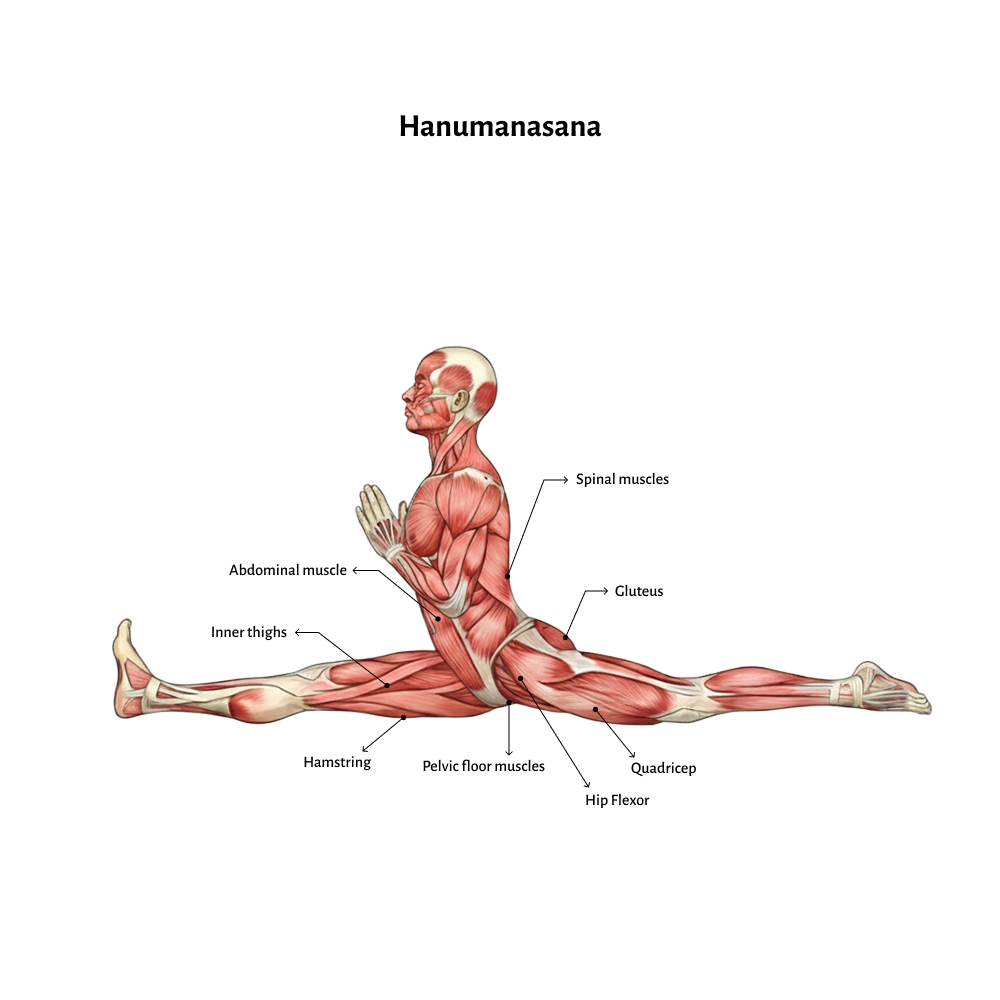 Hanumanasana is a complex pose that involves a deep stretch of several muscle groups: