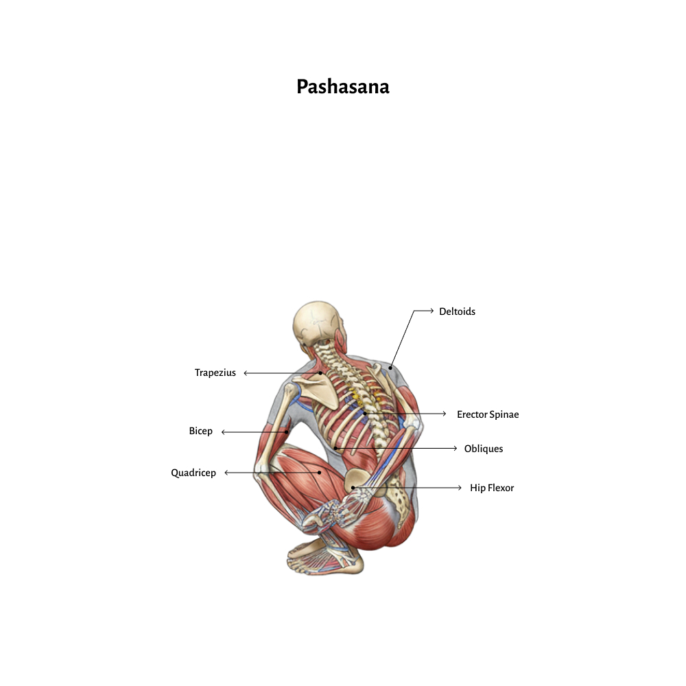 Pashasana (पाशासन), or Noose Pose, is an advanced twisting and balancing yoga pose that combines a deep squat with a spinal twist and a bind. It is a challenging posture that requires flexibility in the ankles, hips, and spine, as well as strength in the legs and core.