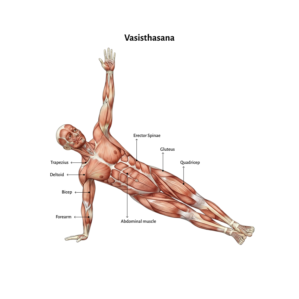 Vasisthasana (वसिष्ठासन), or Side Plank Pose, is a challenging arm-balancing yoga posture that strengthens the core, arms, and legs while improving balance. The pose is named after the sage Vasistha, one of the seven great rishis (sages) of ancient India.